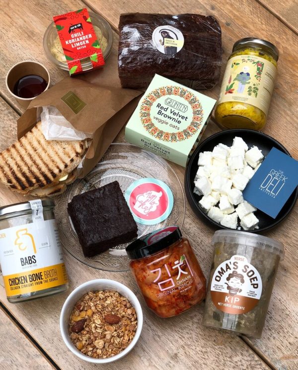 De box is gevuld met 11 artisanale producten van onze food producenten: Oh Na Mi Kimchi, Baked in Amsterdam, Lukowitz, Nono Cakes, SauerCrowd, The Greek Deli Amsterdam, Oma’s Soep, Babs Bone Broth, Grünten, KRUSLI en Van de Koe.